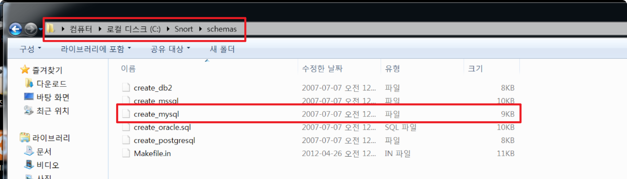 로컬디스크(C:)-Snort-schemas에 위치한 create_mysql 파일을 복사한다.
