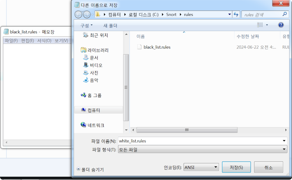 C:\snort\rules 경로에 black_list.rules, white_list.rules를 추가해준다(메모장으로 작성, 파일형식은 모든파일)