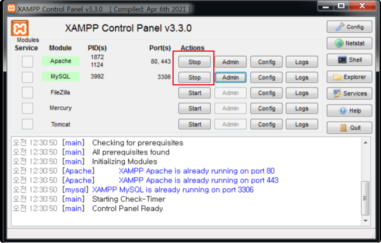 Xampp를 실행하고, Apache와 MySQL을 실행한다. (XAMPP를 실행하면서 다양한 오류들이 발생할수 있다)